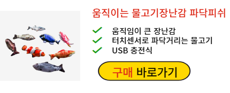 사실적인 프린팅과 움직임에 집사도 고양이도 속는 물고기 자동 장난감입니다. 터치센서에 반응해서 3종류의 움직임이 랜덤으로 실행됩니다. 고양이가 쉽게 질릴 수 없는 마성의 장난감으로 건들때마다 파닥파닥 움직입니다. 움직임이 큰 장난감을 좋아하는 고양이라면 만족할만한 장난감입니다.