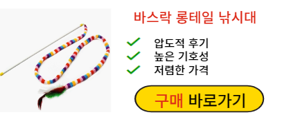 고양이 낚시대중에서도 가장 인기가 높은 바스락 롱테일 낚시대는 이름 그대로 바스락소리로 고양이의 호기심을 자극합니다. 길이도 길고 깃털장식도 화려해 고양이들의 눈길을 끌기에도 좋고 흔들기만해도 고양이들이 신나는 모습을 볼 수 있습니다.